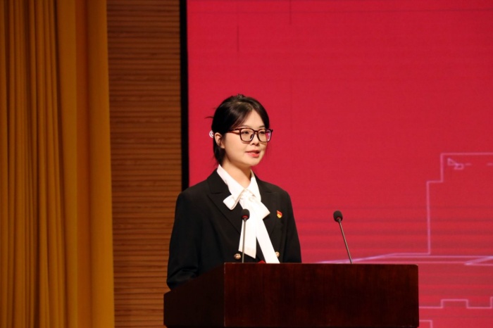 数学学院统计2201班杜俞颖代表新学员发言,号召大家坚定理想信念,践行教育报国使命,坚守“心中有信仰,脚下有力量”的信念,运用马克思主义立场、观点、方法指导实践,确保在教育报国道路上行稳致远。
