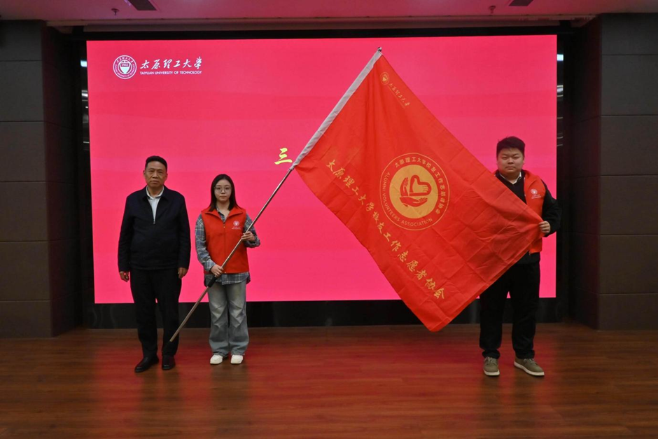 游志勇为校友工作志愿者协会授旗,协会主席团代表上台郑重接旗。旗帜承载着母校期望与校友期盼,激励全体志愿者不忘初心、勇担使命,以志愿之力架起母校与校友的连心桥。