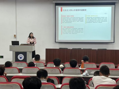 辅导员孟茹从传统智慧与当代实践相结合的视角,深入解读社会主义核心价值观在国家、社会、个人三个层面的深刻内涵。她指出,“勤学修德、明辨笃实”是青年践行社会主义核心价值观的基本遵循,鼓励大家将其内化于心、外化于行、传播于众,努力成为社会主义核心价值观的坚定信仰者、自觉践行者和积极传播者。