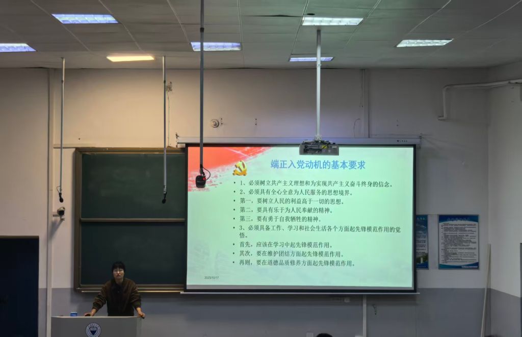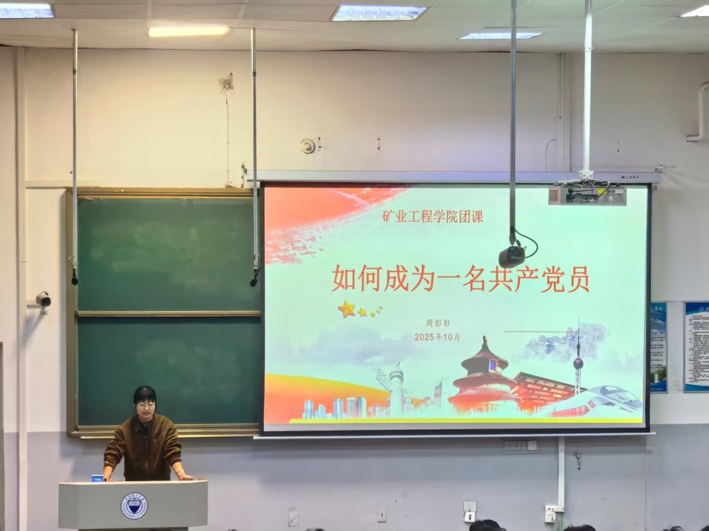 矿业工程学院团委书记周影影以“如何成为一名共产党员”为题,详细介绍了入党动机、入党条件、入党程序、党员义务与权利等基础内容,并且结合自身入党经历与工作实践,向同学们详细解读了 “为什么入党、入党做什么、为党留什么” 的核心问题。同学们进一步明确了入党的初心与方向,未来将以党员标准严格要求自己,在思想、学习、工作中发挥先锋模范作用,积极向党组织靠拢。