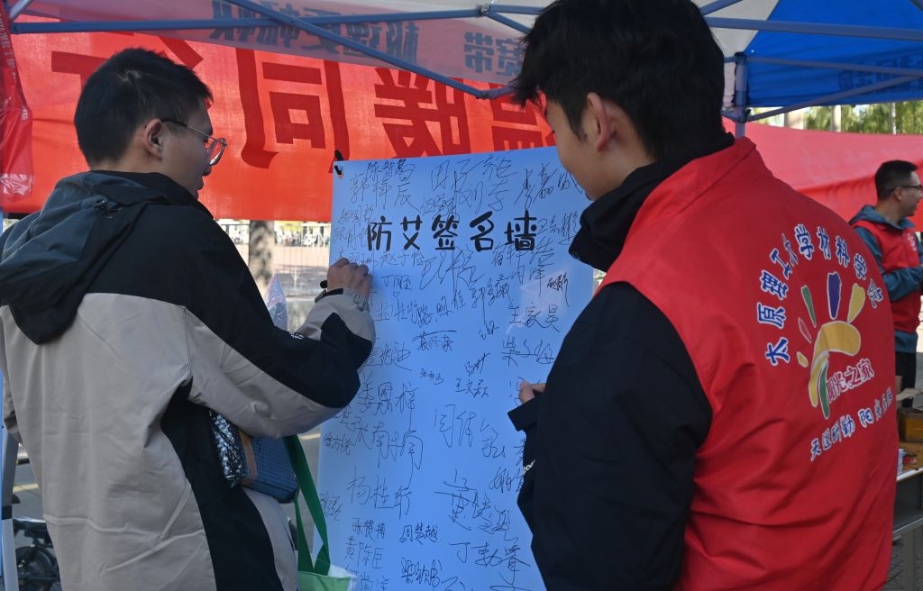 签名墙与“防艾同心网”区域则传递着浓厚的人文关怀,成为活动中最具感染力的环节。在“爱心呵护生命,行动抵御艾滋”主题签名墙上,同学们陆续提笔签名,不同字迹承载着对防艾工作的共同支持与对艾滋病患者的尊重;献祝福环节中,大家在红丝带上写下“愿每一份生命都被温柔以待”“科学防艾,拒绝歧视”等暖心寄语,随后将红丝带悬挂于“防艾同心网”,一条条红色丝带交织成一张温暖的“人文关怀之网”,生动诠释“病毒传播与身份无关”的理念,助力营造包容友善的校园氛围。