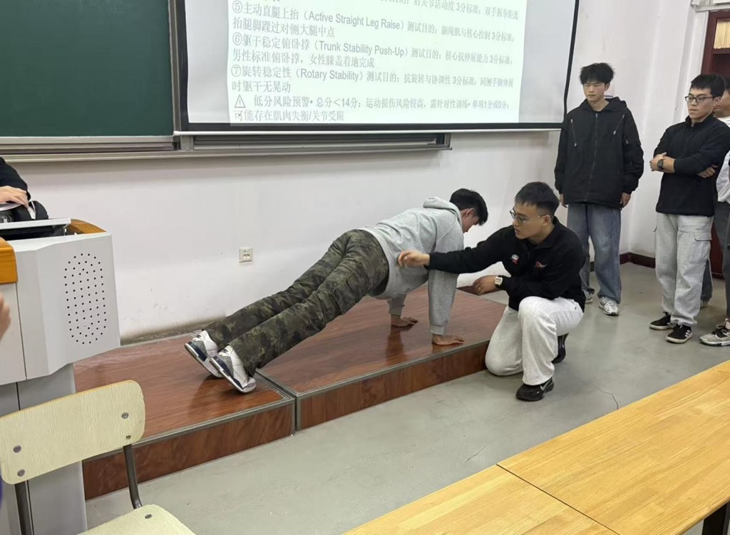 理论讲解结束后,靳文卓治疗师带领学生进入实践互动环节,将劳动技能培训落到实处。他先是规范演示了功能性动作筛查(FMS)中的7个核心测试动作,动作标准、讲解通俗,让学生快速理解动作要领;随后聚焦实用急救技能,现场教学崴脚后的应急绷带包扎方法及运动前关键部位(脚踝、手腕等)的防护包扎技巧,并细致演示肌内效贴的裁剪与粘贴方法。学生积极参与实操练习,主动配合演示的同学还获得了定制小礼品,现场互动氛围热烈,将活动推向高潮。