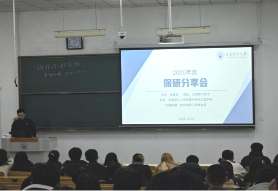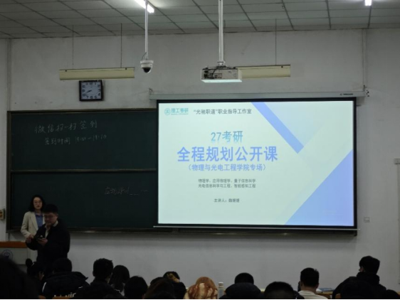 10月24日,物理与光电工程学院联合“光驰职道”职业指导工作室,在行知楼B119教室成功举办考研全流程公开课。活动面向物电学院2027届考研学生,系统解析考研关键信息,吸引了大量同学参与。