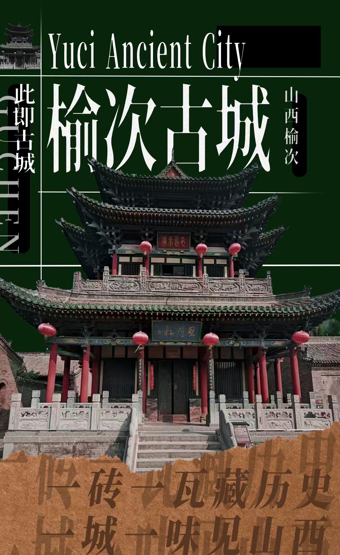 在 “乡韵定格,画说家乡” 的主题下,郭艺璇通过对拍摄的古城小楼进行处理,将榆次古城的古建风华与乡土意蕴凝练于画面。海报聚焦古城中极具代表性的古建,飞檐翘角如灵动羽翼,似衔住晋地的悠悠岁月,古楼的雕梁画栋、朱红立柱间,藏着榆次的岁月温度。本图用深绿底色衬出建筑的古朴厚重,通过古楼上红灯点缀,增添些许烟火气;以中英交融的文字设计,点明 “榆次古城” 的地域身份,底部 “一砖一瓦藏历史,一城一味见山西” 的语句,让古城的一檐一院都成为家乡乡韵的鲜活定格,在画中诉说着榆次的历史底蕴与故土情深。