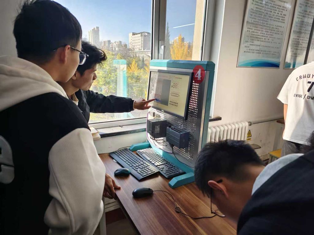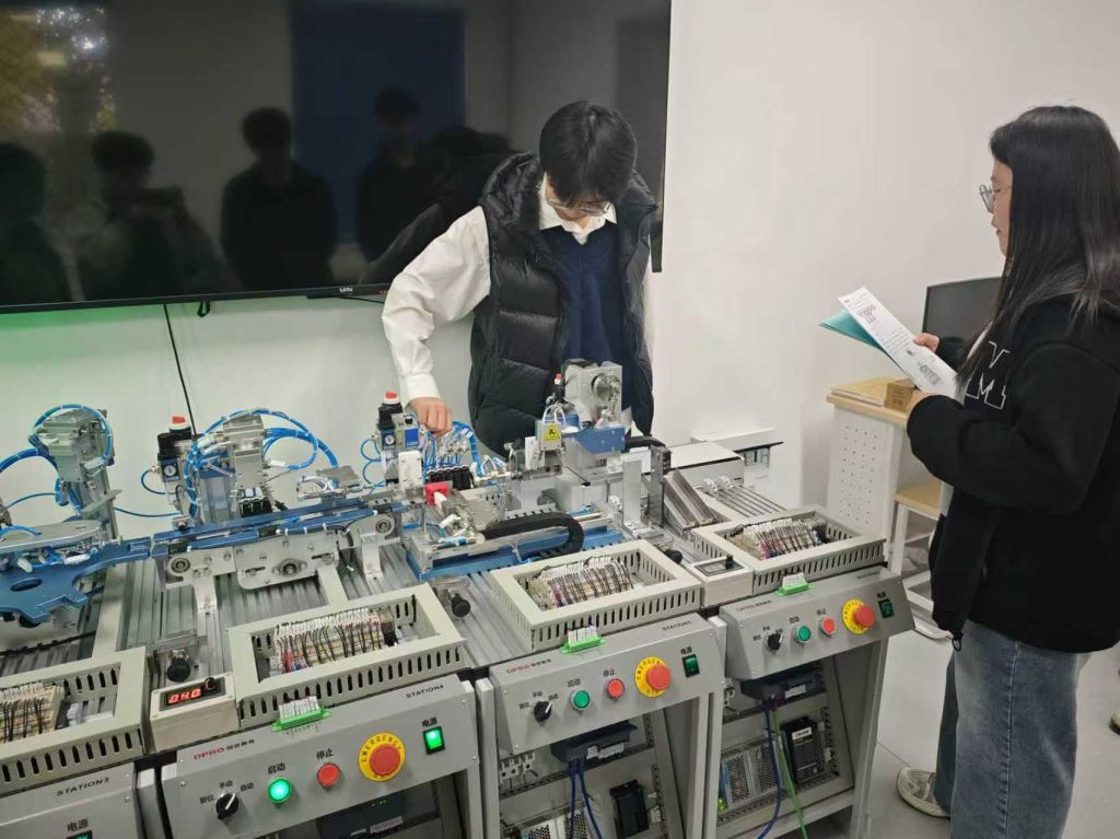 233 教室多维覆盖信息化网络化、运动控制、工程实践三大板块,从工业通讯技术到设备实操应用,形成多维度技术体验链条。信息化网络化方向的同学分析交换机原理,拆解项目任务,借设备演示让学生掌握工业通讯技术;运动控制方向的负责学生讲解设备结构与应用,实操呈现伺服系统等技术逻辑;工程实践方向的学生拆解实训系统工作站实操,让 PLC 等技术落地。