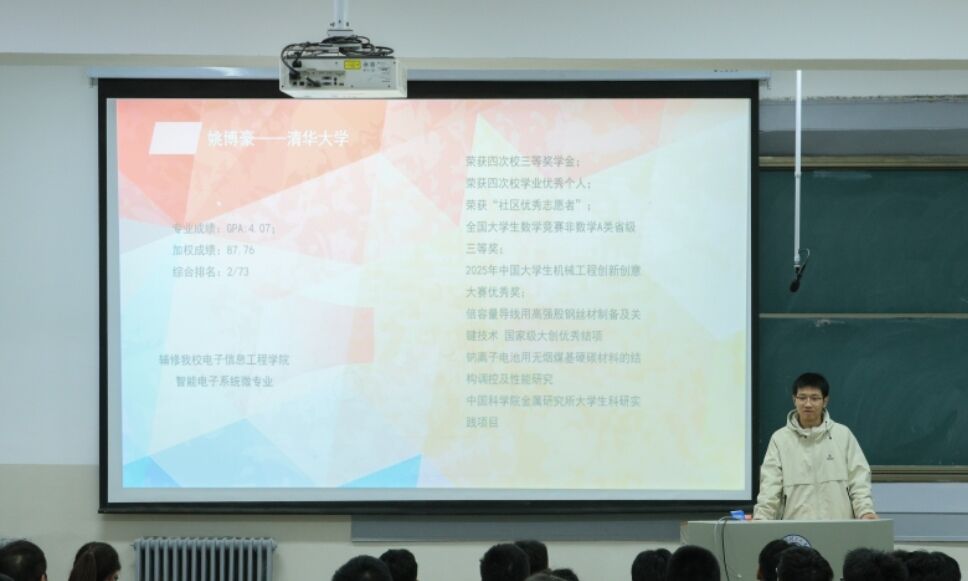 分享会上,各位优秀学子从自身经历出发,带来了多维度、深层次的干货分享:成功跨保至清华大学的姚博豪,以其“材料+电子信息”的复合背景,为同学们展示了跨学科发展的无限可能,打开了专业视野的新窗口;同样保研至浙江大学的路景宇和李云飞,则分别从“学业标杆”和“竞赛先锋”的角度提供了宝贵建议。