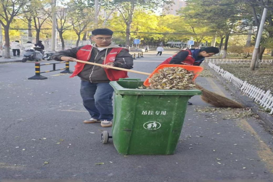 深秋的虎峪校园,银杏叶裹着暖阳铺满步道,恰应了“我言秋日胜春朝”的诗意——但落叶的堆积既影响通行,也让校园少了几分清爽。活动开展期间,志愿者早早奔赴集合点:靓丽的“红马甲”穿梭在校园,洁净的行动热火朝天。面对堆积的落叶与隐蔽的垃圾,同学们没半分懈怠:遇到黏在路面的残叶就反复清扫,碰到花坛深处的杂物便弯腰伸手捡拾,三五成群的配合里,既有“抢着干”的热情,也有“搭把手”的默契,把不怕苦、不怕累的劳动本色与青春担当写在了忙碌的身影上。