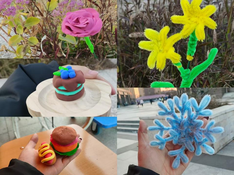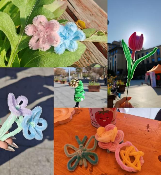 扭扭棒DIY同样人气高涨,柔软易塑形的彩色扭扭棒在同学们手中仿佛拥有了魔力,经过扭转、弯曲、拼接等简单操作,逐渐变成一个个生动可爱的手作萌物。制作成品琳琅满目:既有憨态可掬、灵动俏皮的动物造型,也有以花朵、雪花为主题的精致摆件,更有同学发挥奇思妙想,创作出眼镜、发夹等实用饰品。这些看似简单的彩色扭扭棒,实则蕴含着丰富的意义——它是释放创意的载体,是舒缓压力的出口,更是传递温情的媒介。
