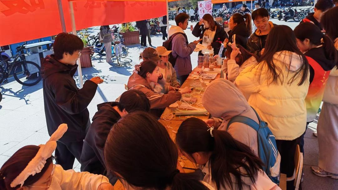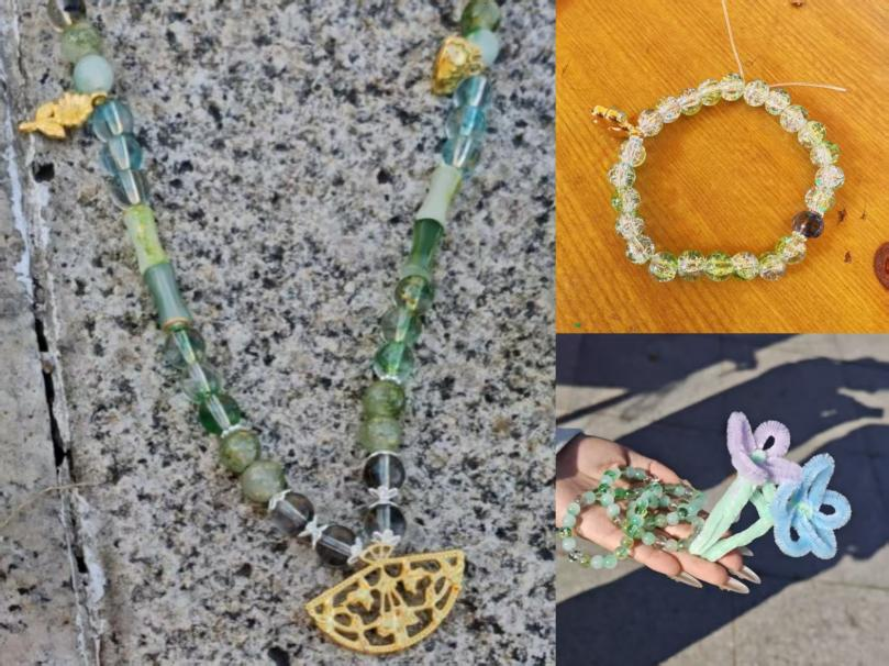 串珠创作区的桌子上,五彩琉璃珠与闪亮合金配件错落排列、光泽流转,瞬间吸引了同学们的目光。大家驻足挑选,或偏爱清新雅致的冷色调搭配,或钟情活泼明快的撞色组合,在材料的甄选间勾勒创意雏形。穿珠、引线、打结,指尖翻飞间,原本零散的珠子被赋予了生命力,渐渐凝结成款式各异的精美手串。这一串串流光溢彩的手作,不仅承载着制作者的专注与心意,更化作一条条温暖的纽带,将同学情谊与冬日暖意牢牢串联,让每份美好都有了可触摸的质感。