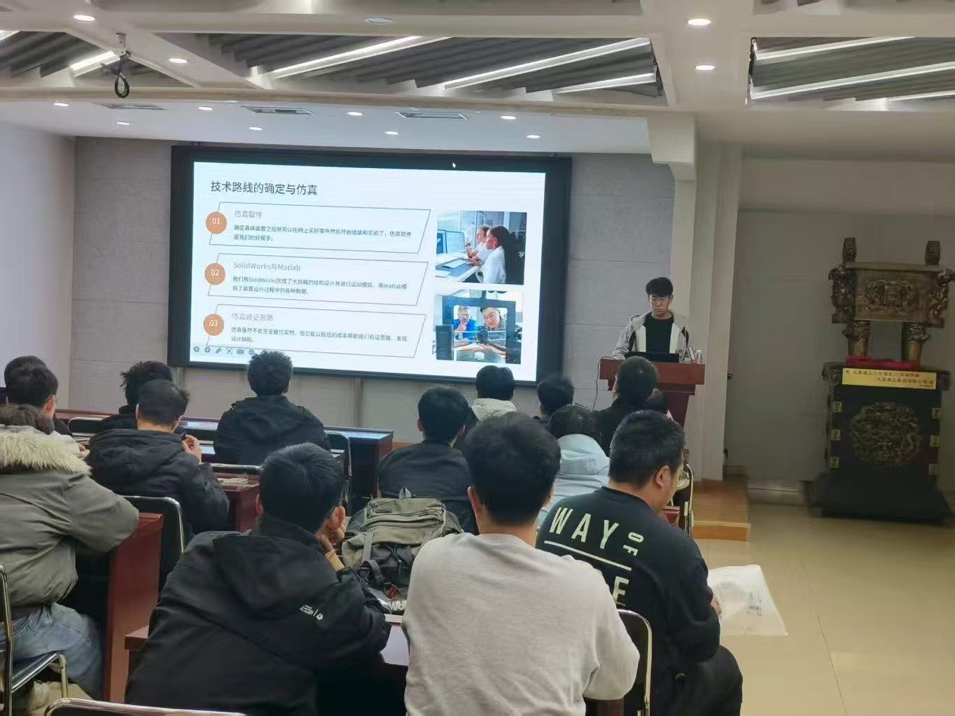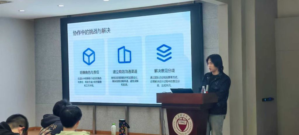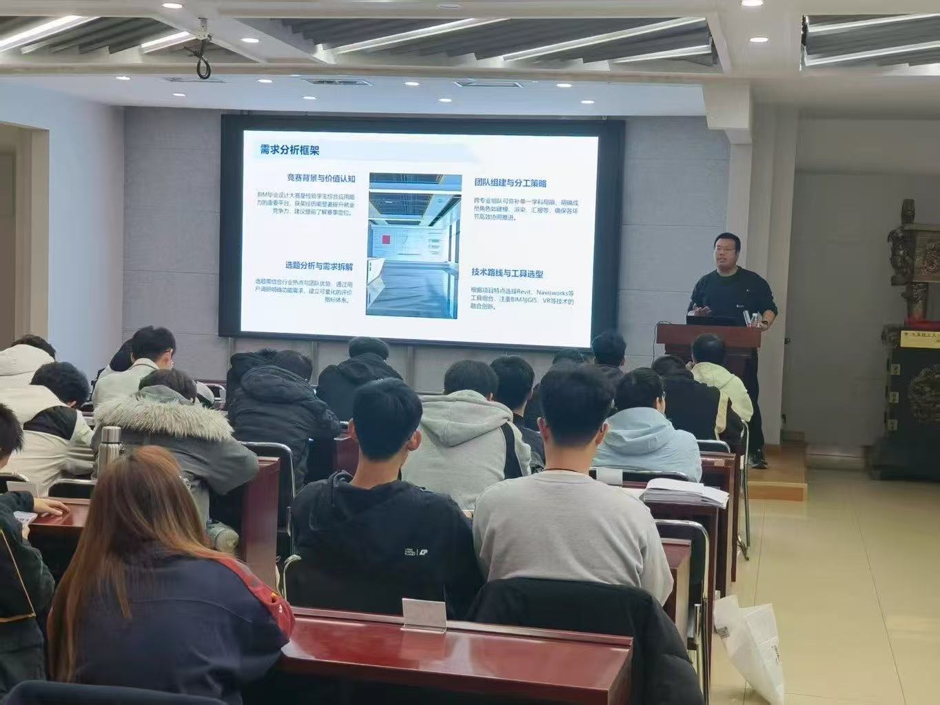 随后,刘洋结合自身指导“挑战杯”竞赛的丰富经验、典型案例,为同学们带来了精彩分享。他从“挑战杯”竞赛的赛事定位、选题方向、团队组建、作品打磨等方面进行了详细讲解,鼓励同学们勇于尝试、敢于突破,在竞赛中积累经验、提升能力。最后,辛家宝、陈泓泽、戴睿晗就自己带队参加的结构设计竞赛、BIM设计竞赛、节能减排竞赛分别进行了分享。
