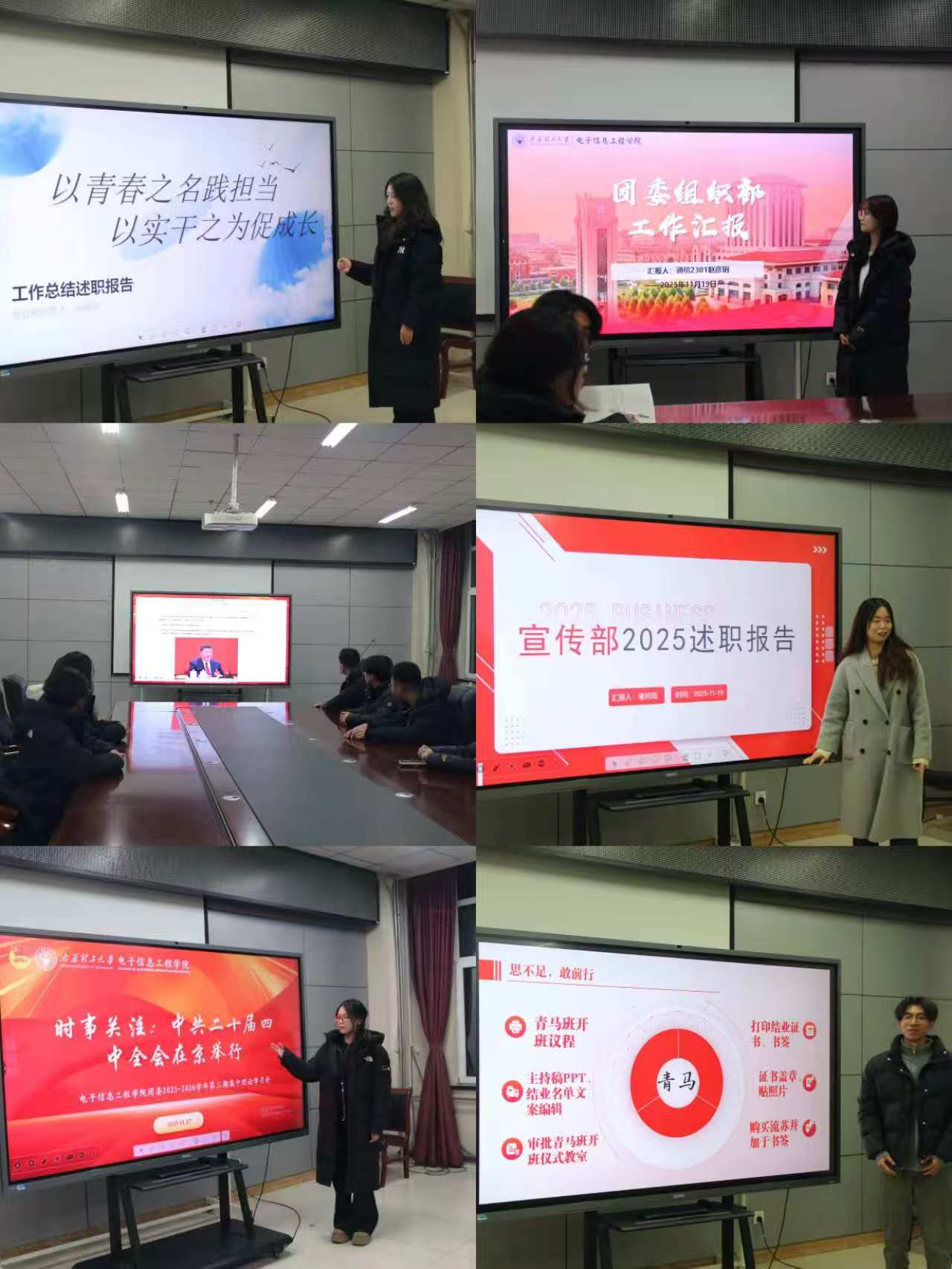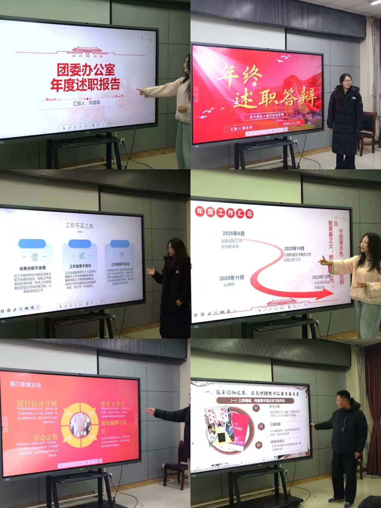 会议分为述职汇报与集中学习两大环节。述职环节中,团委各部门负责人依次通过PPT展示与现场汇报的形式,围绕思想引领、组织建设、服务同学、团务工作等核心工作展开阐述。