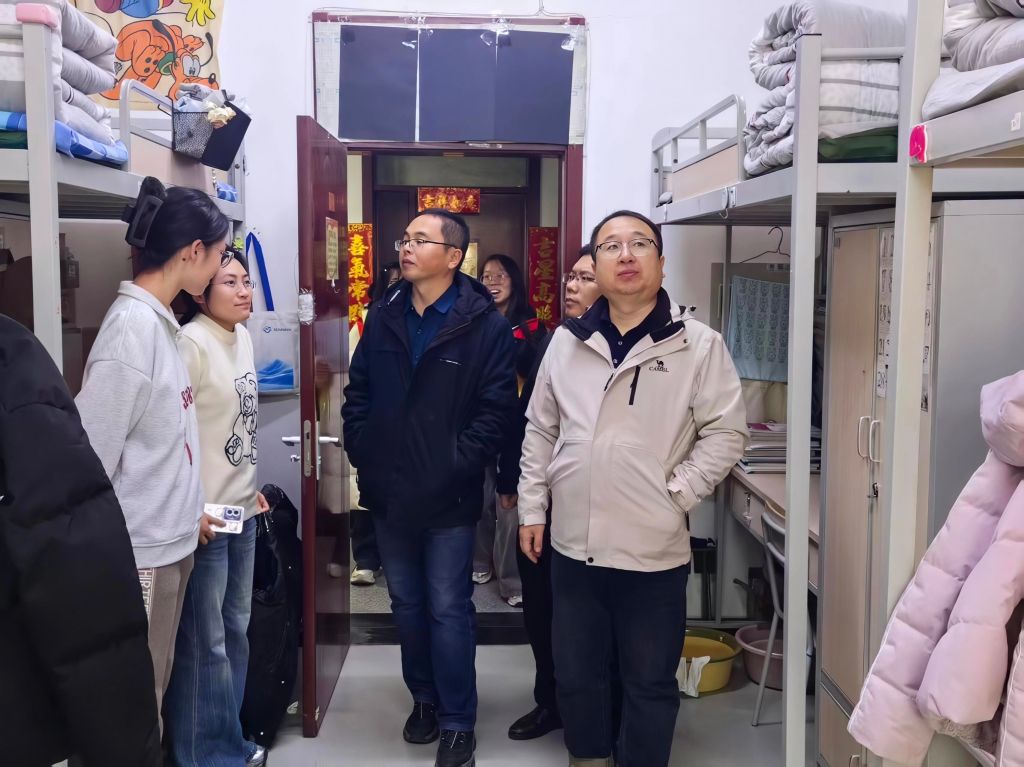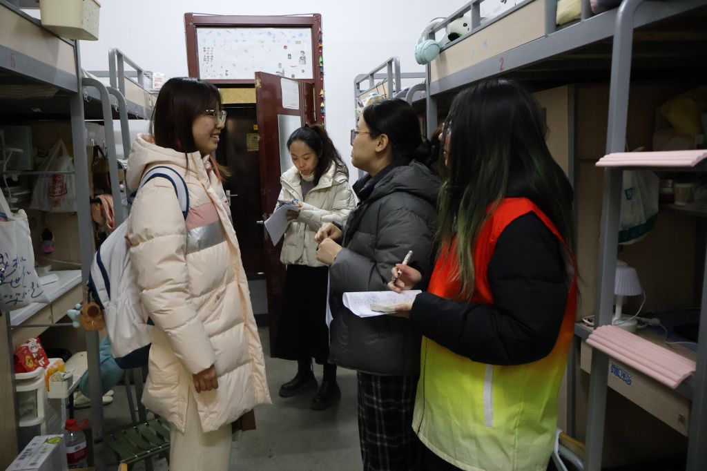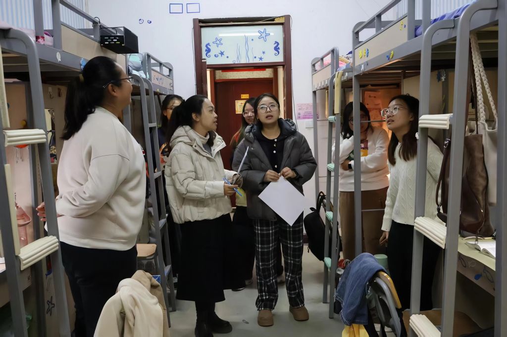 11月26日,由学院辅导员、班主任老师及学生代表组成查寝小组深入各年级学生宿舍,开展全面走访检查。查寝过程中,老师们秉持严谨细致的态度,重点查看宿舍卫生清扫情况、物品摆放规范度、用电安全及消防隐患等关键环节,对桌面杂物整理、衣柜衣物收纳、阳台通风采光与公共区域清洁进行细致检查并记录。
