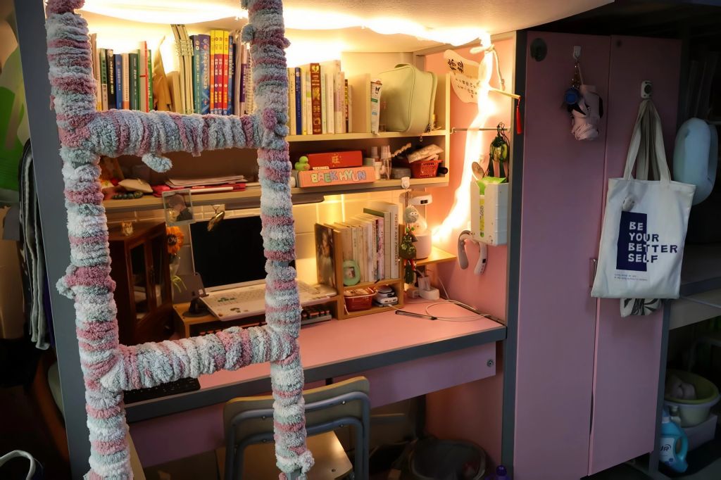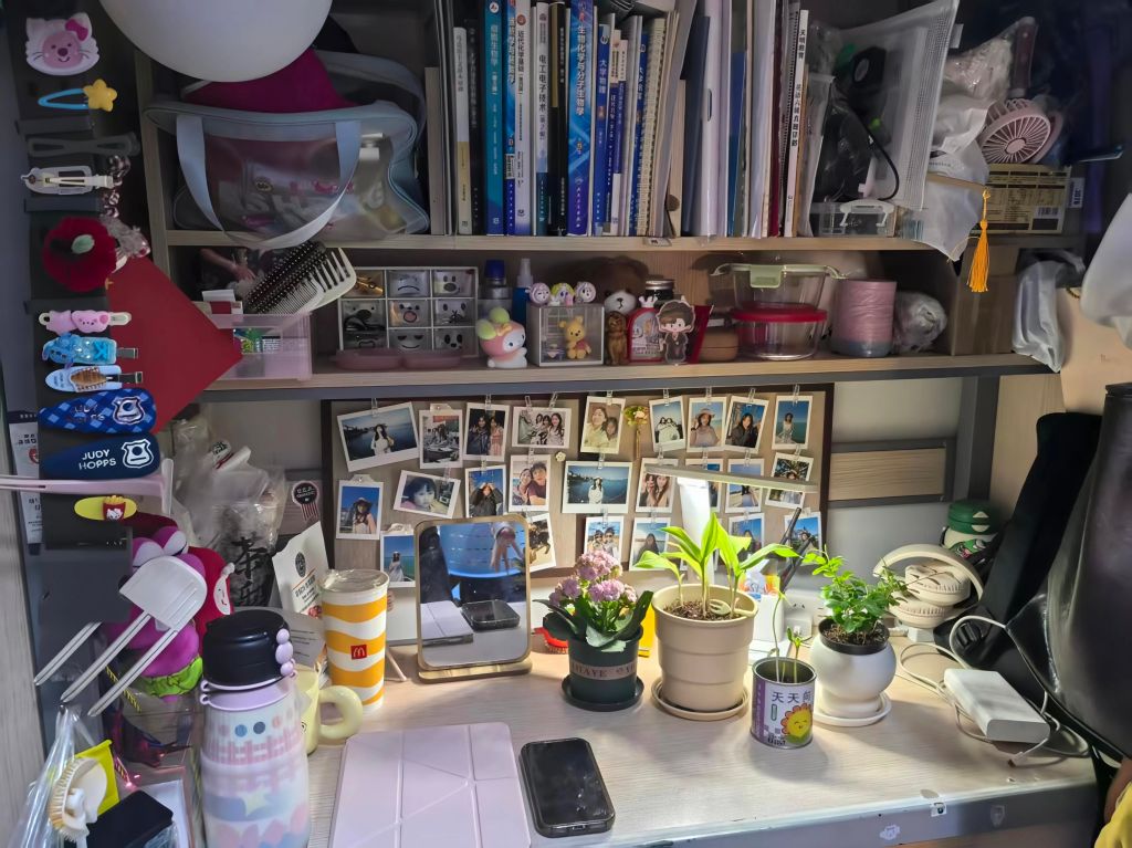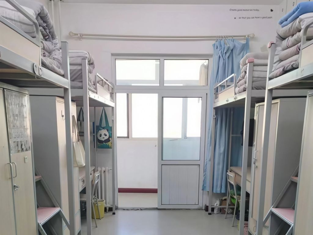 桌面,衣物折叠规整收纳于衣柜,地面窗台干净明亮,空气清新无异味。部分宿舍还巧妙融入个性化布置,简约的绿植点缀角落,亲手绘制的装饰画增添温馨感,既彰显了青春活力,又不失整洁有序的原则。