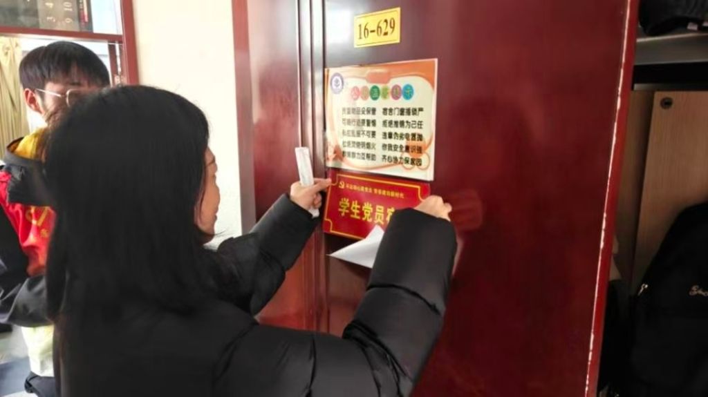 本次查寝过程中,学院还同步开展了“党员宿舍”标识张贴工作。查寝小组为学生党员宿舍张贴了醒目的标识牌,引导党员同学主动亮明身份、自觉扛起责任,鼓励他们在日常卫生保持、文明习惯养成、集体氛围营造等方面走在前、作表率,以实际行动发挥先锋模范作用。这一举措不仅强化了学生党员的责任意识,也为广大同学树立了可见、可学、可比的榜样标杆。