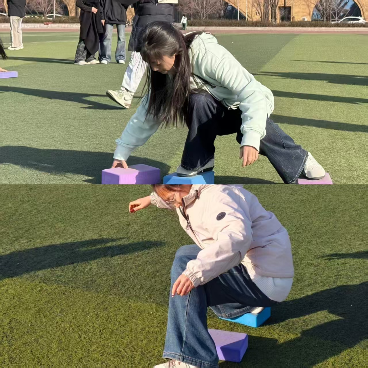 作为考验策略与耐心的经典项目,摸石头过河让赛场氛围愈发紧张刺激。每队仅有的3块“石头”成为通往终点的唯一路径,各宿舍分工明确:有的专注移动“石头”,有的时刻提醒队友保持平衡,大家各司其职、互相配合。每一步的谨慎前行,每一次的互相提醒,都彰显着宿舍成员间无需言说的信任与团结。
