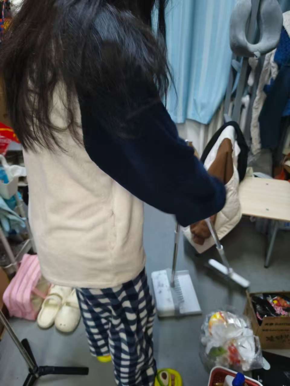 地面清洁组”的成员们则是宿舍环境的“美容师”。他们手持扫帚、拖把等工具,向卫生死角发起总攻。从床铺与地面的狭窄缝隙,到阳台容易积灰的边角,每一处都不曾被遗忘。连散落的零食碎屑、细微的头发丝都被彻底清除。汗水挥洒间,原本蒙尘、发灰的地面逐渐恢复了本色,最终变得光可鉴人,映照出同学们忙碌而满足的笑脸,也折射出认真对待生活的态度。