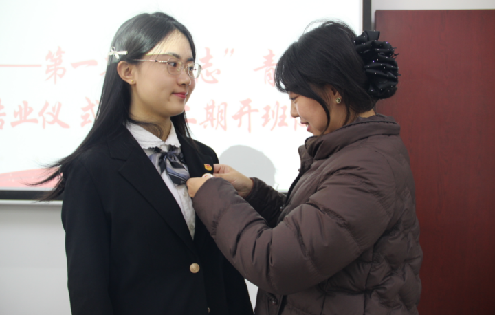 最后,为将青马精神从理论学习延伸至实践传承,在此次仪式中,特别增设“信仰接力”环节,苏林静为全体第二期学员分发由上一期学员制作的书签,同时展示了本期的红色经典读物,并为学员戴“班徽”,以信物承载初心,用创意传递使命。