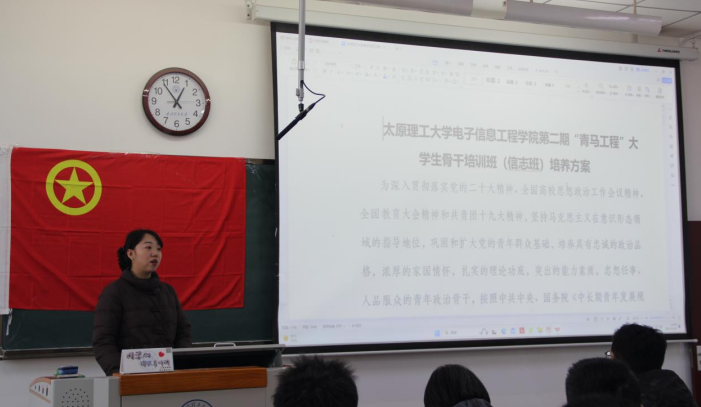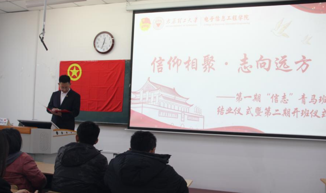 为深入贯彻学习习近平总书记系列重要讲话精神,培养德才兼备、全面发展的青年马克思主义者,不断提高青年学生骨干的思想政治素质、理论政策水平、实践创新能力,电子信息工程学院于11月18日在明向校区行远楼B320教室举行第一期“青马工程”大学生骨干培训班(信志班)结业仪式暨第二期开班仪式。两期学员共同参加本次会议,院党委副书记邓雅媛、院团委负责人苏林静、青年教师代表樊骁和赵华华受邀出席本次会议。学生团委副书记张鼎崴主持本次会议。