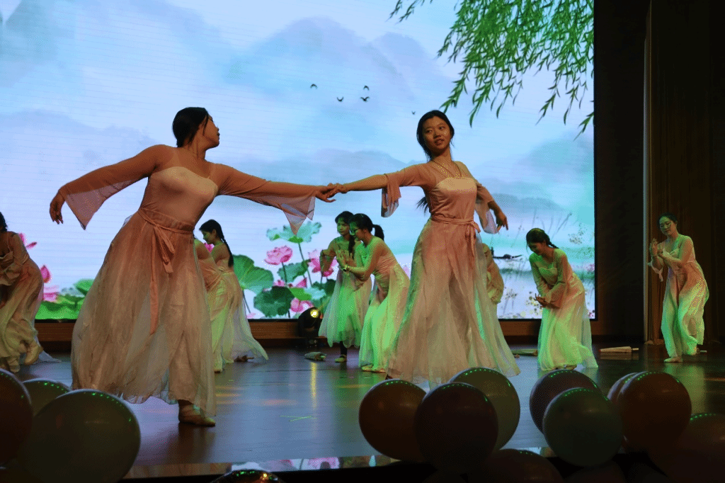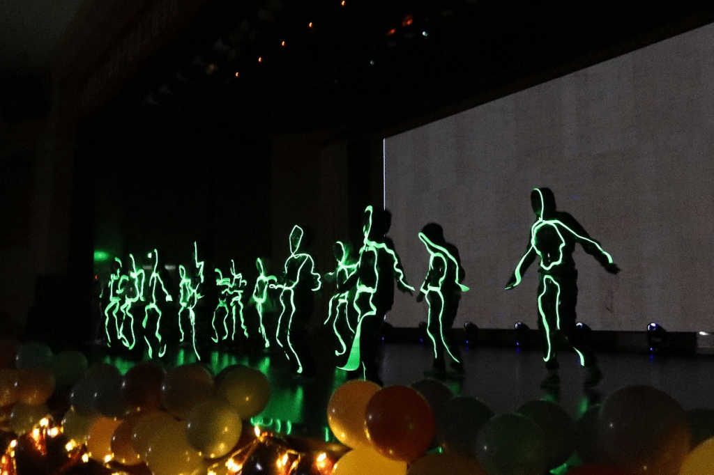 “学启新篇·向未来”篇章将整场活动的氛围推向高潮,青春的热忱与对未来的期许在此刻交织。电子信息工程学院新媒体以温暖歌声演绎《Always Online》,旋律轻快、歌声温暖;学院学生会带来的舞蹈《荧光舞》,光影流转间舞步灵动,荧光与青春的光芒相互辉映,勾勒出独属于年轻一代的活力与璀璨。