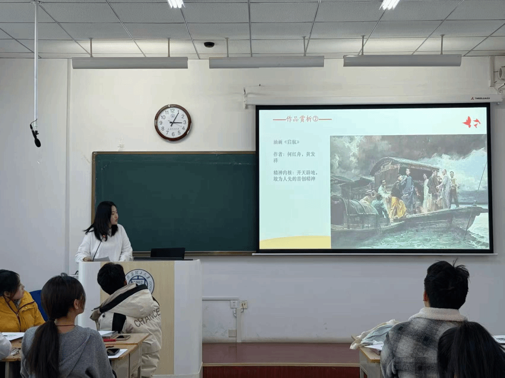 魏思雨同学从艺术专业视角赏析油画《启航》,解读其构图、人物刻画与环境营造,阐释画作再现中共一大南湖会议历史瞬间所蕴含的信仰力量与时代寓意。元万旭同学从历史维度讲述中共一大召开的背景、过程与意义,阐述“开天辟地大事变”的历史必然性。理论讲解后,同学们亲手制作竹编红船,将艺术感悟与历史认知转化为红色作品,体悟“红船精神”的当代传承。