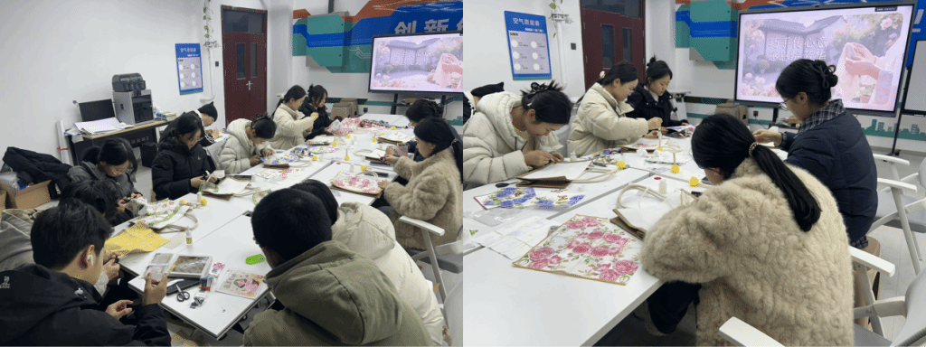 活动现场温馨雅致、氛围热烈。在蝶古巴特麻布袋DIY区域,负责同学详细讲解蝶古巴特艺术的起源与制作技巧,示范图案剪裁、胶水涂抹、拼贴定型、封层加固等步骤。同学们精心挑选纹样素材,将清新花卉、简约文字、创意插画等元素巧妙搭配,为朴素的麻布袋与帆布包注入艺术活力。大家相互交流配色灵感、分享制作心得,一件件独一无二、兼具美观与实用的手提袋相继诞生,尽显创意与巧思。
