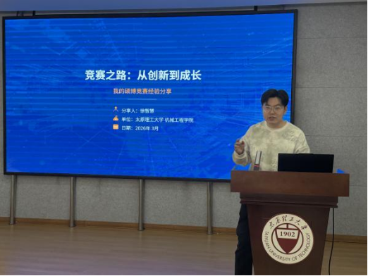 来自机械工程学院的硕士生徐智慧,则聚焦 “竞赛与学业协同发展” 主题,分享了自己在 “互联网 +”“挑战杯” 等国家级赛事中勇夺金奖的实战经验。他不仅细致拆解了项目从选题、筹备到落地的全流程,还针对研究生普遍关注的“学业与竞赛平衡”“时间高效管理”“身心健康维护” 等问题,提出具体可行的建议,为在场同学提供了可借鉴的实践路径。