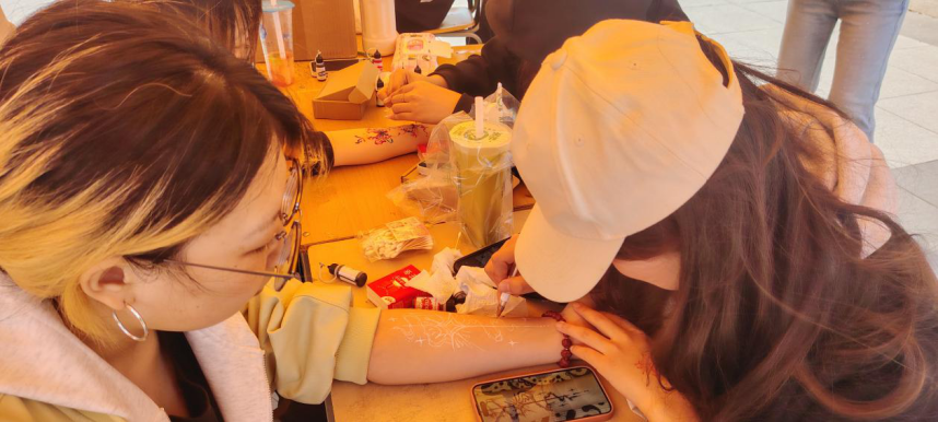 除了传统体育项目,创意手作区也为活动增添了别样色彩。“腕底生花”海娜彩绘吸引了不少同学排队体验,彩绘师以花卉为主题,在同学们的手背、手臂上勾勒出栩栩如生的蝴蝶等精巧图案。“绕指生花”扭扭棒折花则让同学们在动手制作中感受创造的乐趣,一朵朵栩栩如生的花在指尖诞生,成为可带走的春日纪念。