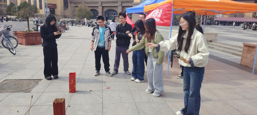 活动现场热闹非凡,精心设计的互动环节吸引同学们纷纷驻足体验。在投壶区域,同学们屏息凝神,手持羽箭,一次次尝试将箭投入壶中。“别有洞天”闭眼转三圈踢球则充满了欢笑与挑战,同学们闭上双眼,在转圈后挥舞球杆,将小球打进球门。