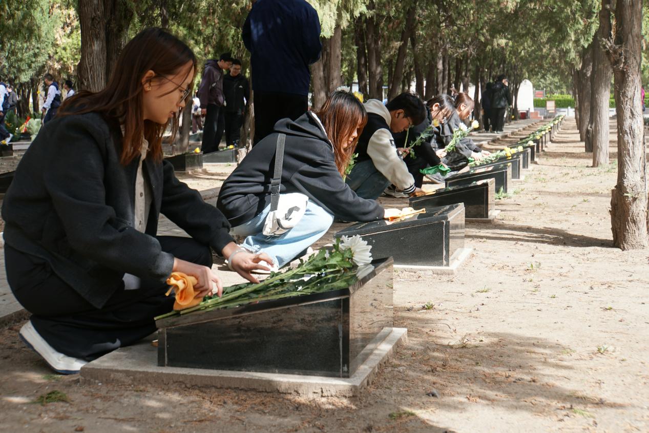 默哀完毕,学员们有序前往烈士墓区,开展擦拭墓碑、敬献鲜花活动,用实际行动寄托对英烈的哀思。大家手持干净的抹布,小心翼翼地走到每一块烈士墓碑前,轻轻拭去碑身的尘土,动作轻柔而庄重,仿佛在触摸一段段厚重的历史,与英烈们进行一场跨越时空的对话。擦拭完毕后,学员们手持洁白的菊花,依次将鲜花敬献在墓碑前,告慰英烈忠魂。一束束洁白的菊花,寄托着无尽的哀思;一个个庄重的身影,彰显着青马学员的赤诚之心;一句句深情的寄语,承载着青年一代的责任与担当。