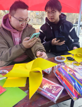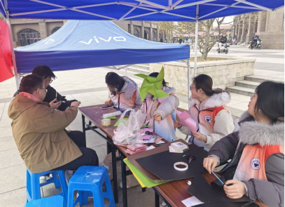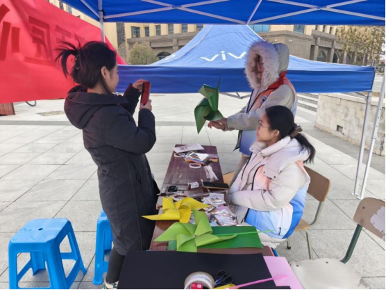 春日的阳光温柔和煦,明向校区西区小广场上,志愿者帐篷整齐排列,彩色卡纸、画笔等物料摆放有序、色彩鲜亮,处处透着治愈的气息。同学们围坐在一起,或低头创作,或轻声交流,不时传来爽朗的笑声;志愿者们穿梭其间,耐心解答疑问、协助大家操作,娴熟又热情。微风轻拂,欢声笑语随风飘荡,小广场洋溢着温馨的气息,青春的朝气与奉献的温情交织,暖意融融。