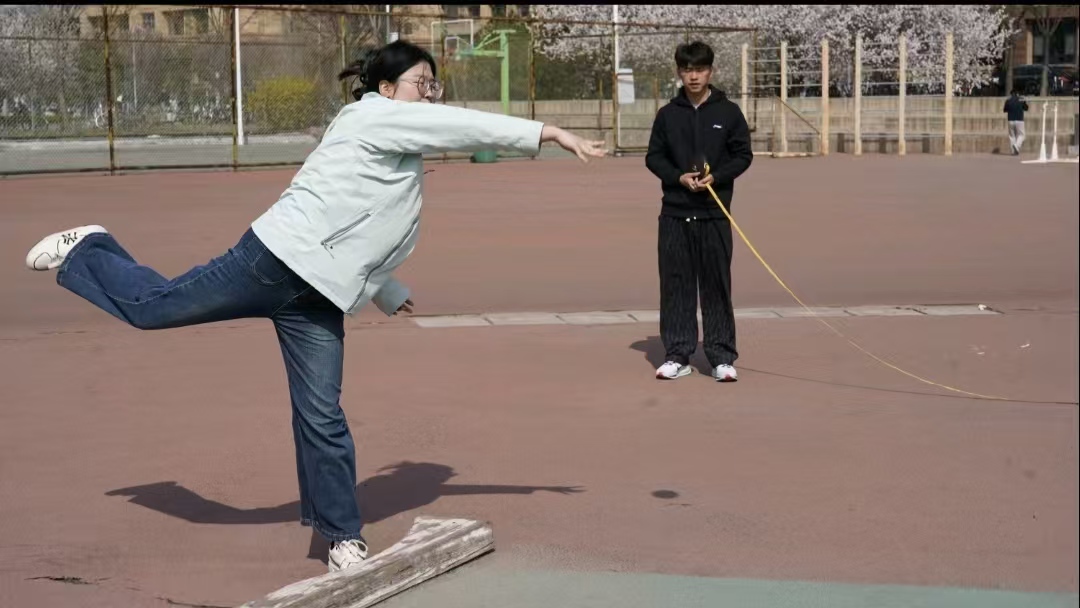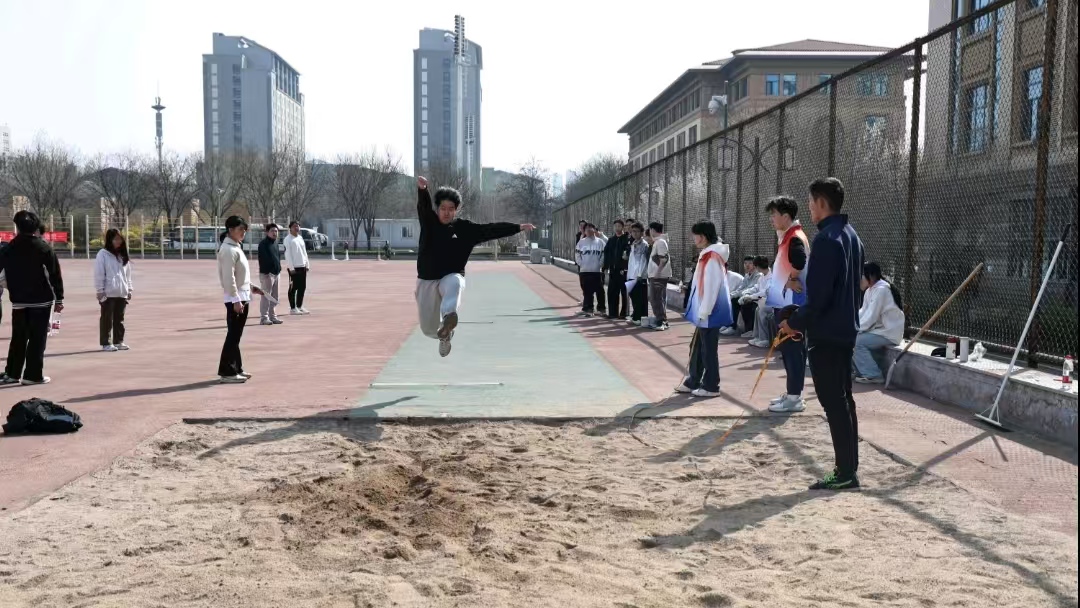 跳远沙坑旁,选手们认真进行赛前热身,有的反复练习助跑节奏,有的调整起跑姿势。助跑时,他们逐渐加速,眼神坚定地盯着起跳线;起跳瞬间,双脚蹬地发力,身体在空中划出优美的弧线,双臂向后摆动以增加跳跃距离;落地时,他们屈膝缓冲,稳稳站在沙坑中,沙粒飞溅的瞬间,定格成赛场最具动感的画面。