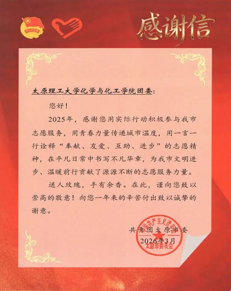 3月30日,2026年“青春太原”志愿服务展示交流活动在太原学院举办。化学与化工学院团委荣获共青团太原市委颁发的感谢信,充分肯定了化学与化工学院团委在2025年度志愿服务工作中的突出贡献与青春担当。