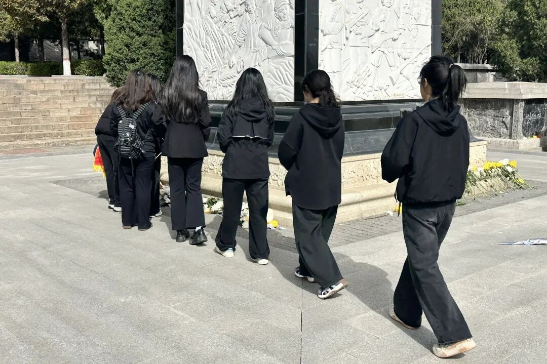 陵园之中,烈士纪念碑巍然矗立、庄严肃穆,镌刻着先烈们的英魂与风骨。全体青马学员整齐列队、垂首肃立,向为民族独立、人民解放与抗战胜利英勇献身的革命先烈默哀致敬。默哀毕,大家依次缓步上前,将鲜花轻献碑前,躬身致礼。